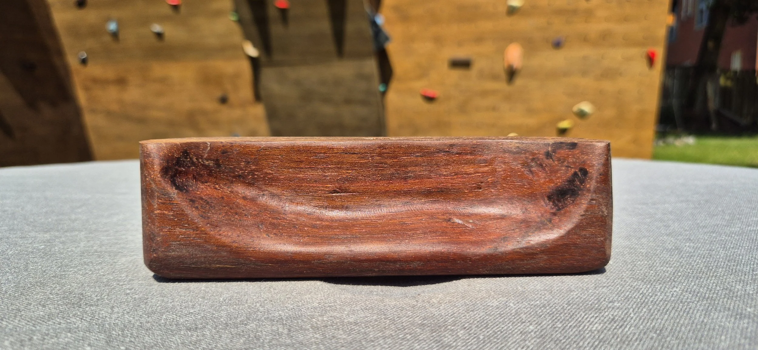 This handcrafted climbing hold is made from dense azobé wood and shaped into a smooth, ergonomic edge. Unique to this piece, the natural grain patterns on the front have been intentionally filled with black epoxy, adding both visual contrast and durability. The surface is finely sanded and oiled for long-lasting outdoor use and superior skin comfort. Ideal for intermediate to advanced climbers looking for natural grip texture and aesthetic refinement.