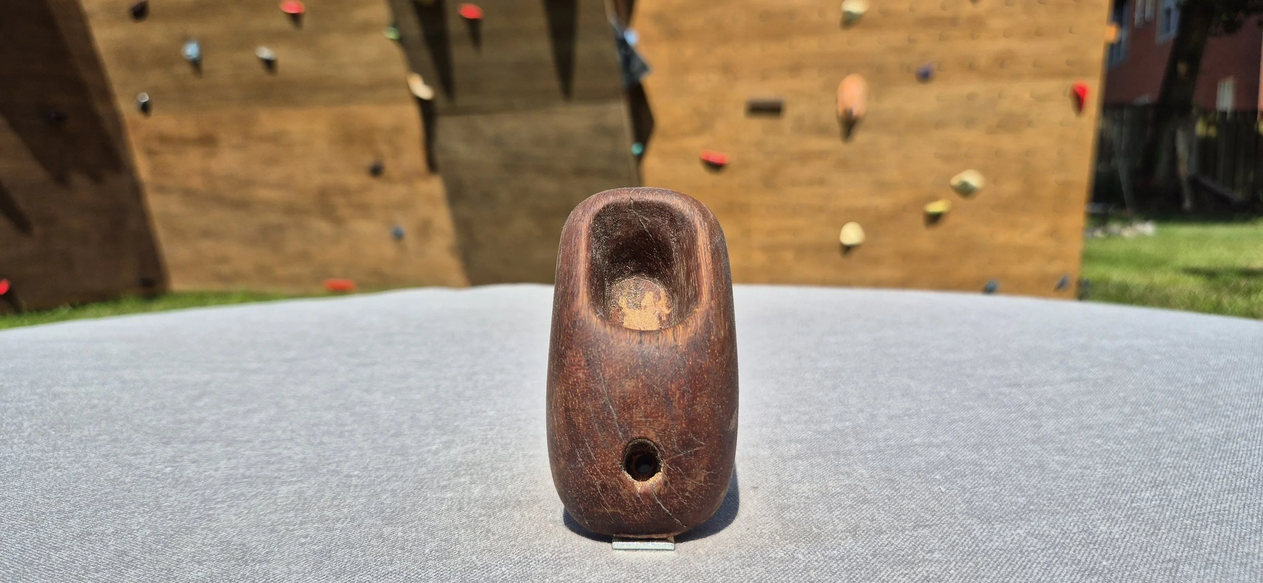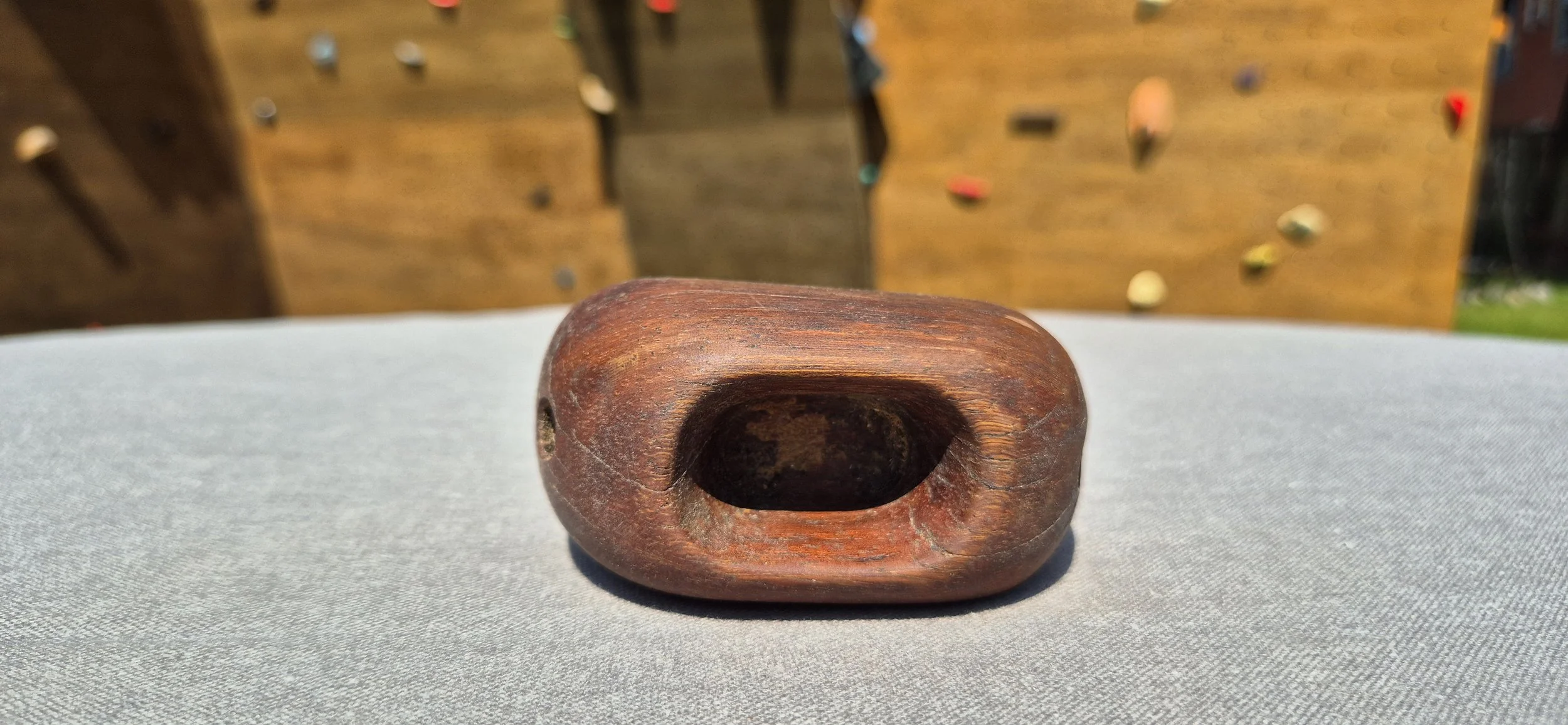 This single handcrafted climbing hold is carved from durable azobé hardwood and features a deep, rounded pocket that comfortably fits one to two fingers. The smooth, natural contours make it ideal for controlled pull movements, finger strength training, or as a dynamic thumb catch in overhangs. Its ergonomic shape minimizes finger strain while offering a challenging grip.
